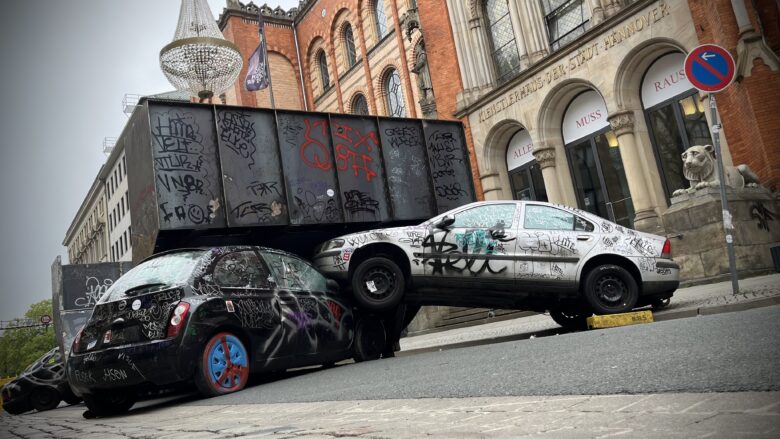 Nach dem ersten Schockmoment kam mit der Erinnerung rasch auch die Entwarnung: Das ist kein Unfall. Das ist Kunst. Wie in Hannover üblich, kann davon schon mal der Straßenverkehr beeinträchtigt werden. Es handelt sich um die Kunstinstallation „Crash Pipe“ der gefeierten Star-Choreografin Florentina Holzinger. Die Stadtverwaltung selbst schreibt von „frischem Schwung“, den die Auto-umrankte Rollschuh-Rampe zunächst auf der Sophienstraße vor dem Künstlerhaus in die Landeshauptstadt bringen soll. Ich merkte davon zunächst wenig, mich bremste die Kunst bloß aus.